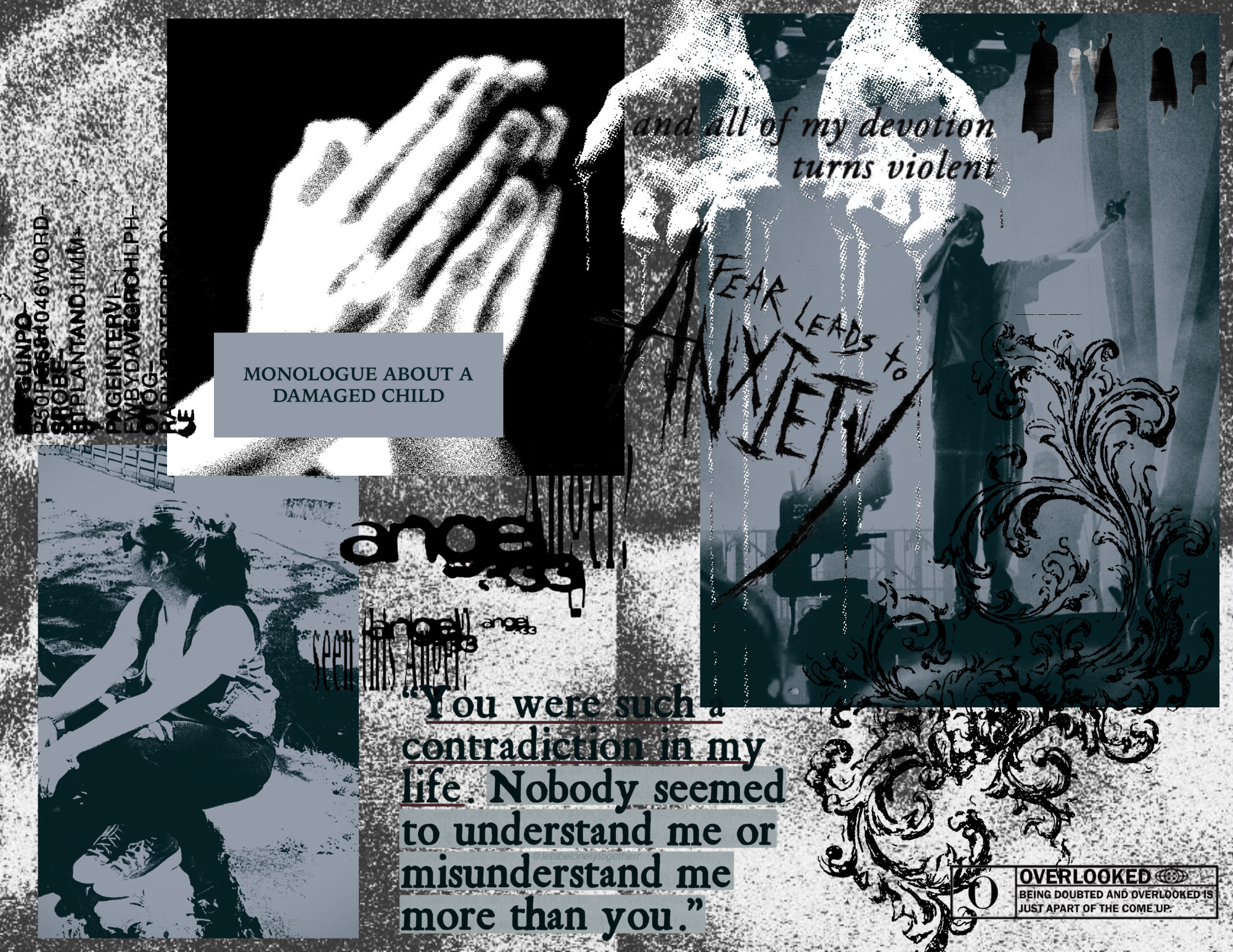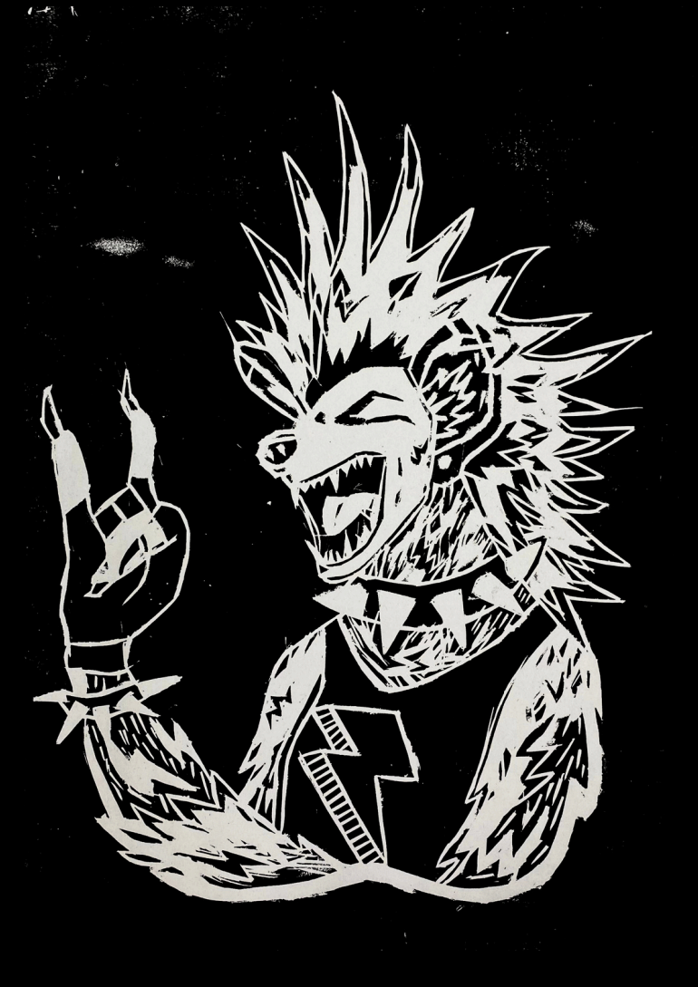 Woodcut print on neon paper & reclaimed denim, hand embroidery.